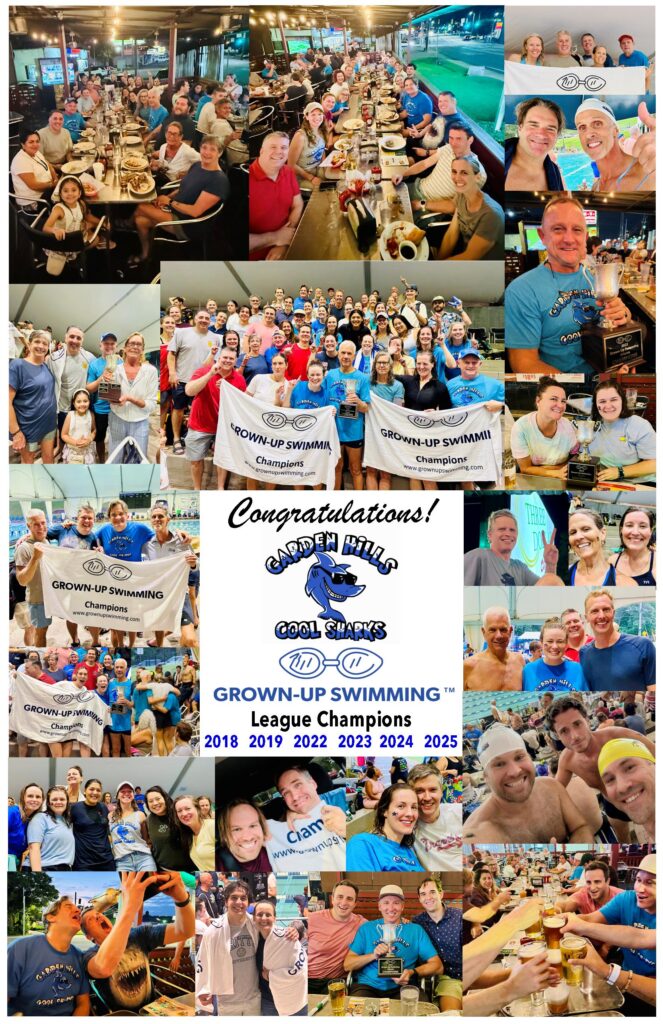 The Garden Hills Adult Swim Team – Atlanta Adult Swim League Champions in 2018, 2019, and 2022, 2023, 2024 and 2025, will make another run for those prestigious championship towels in 2026! The adult league, now known as “Grownup Swimming”, is planning 4 summer “regular meets” and, of course, the all-important Championship Meet to be held in August.